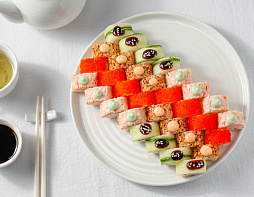 Ролл в краб миксе с мидиями, масаго, салатом айсберг, сливочным сыром, луком и кремом Васаби,
